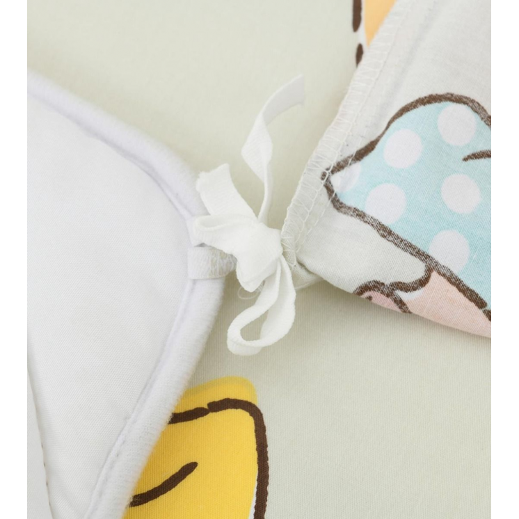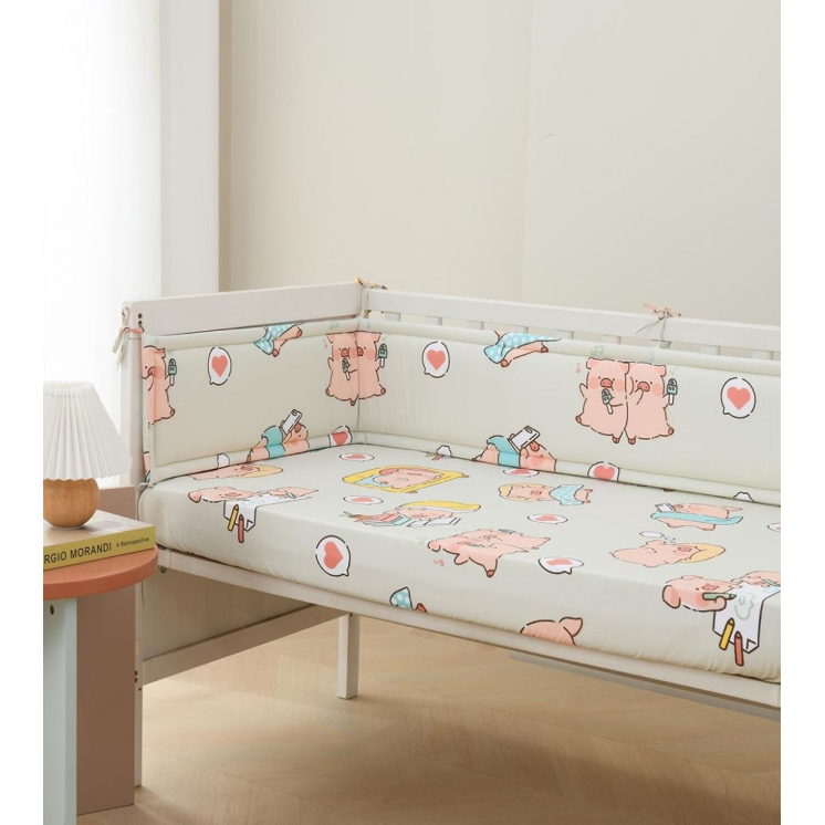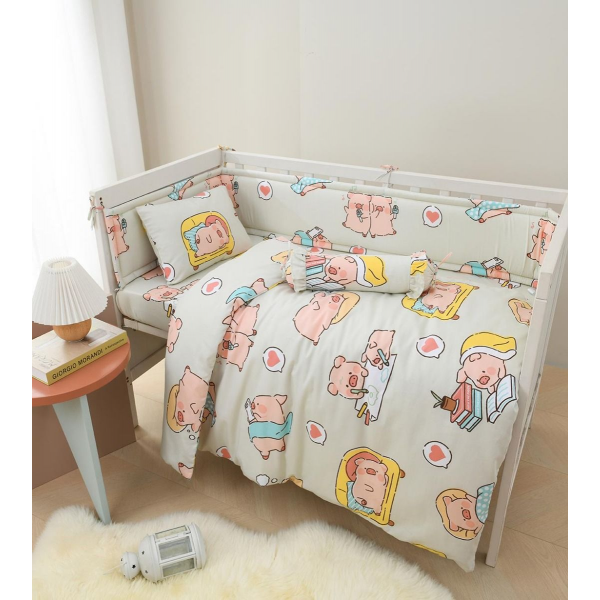 採用100%天然純棉,不對嬰兒皮膚有任何刺激或副作用,呵護嬰兒幼嫩肌膚;棉質且吸濕透氣力強,可吸收環境中的水分而令質感更柔軟,令寶寶體驗自然舒適與柔軟。套裝已包括枕袋、枕芯、攬枕袋、攬枕芯、智慧被袋、薄被芯、床笠,及床邊圍2件。
