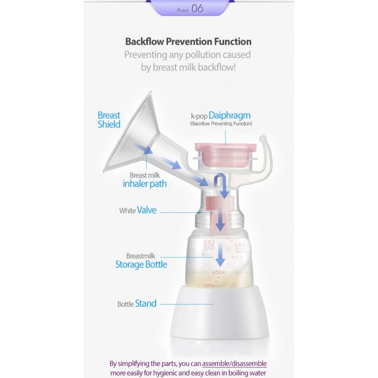 Unimom K-pop 充電式電動單邊吸乳器設計輕巧,方便攜帶,使用寧靜,方便隨時把餵哺嬰兒後剩下的乳汁抽出,舒緩乳房疼痛 (俗稱谷奶)。