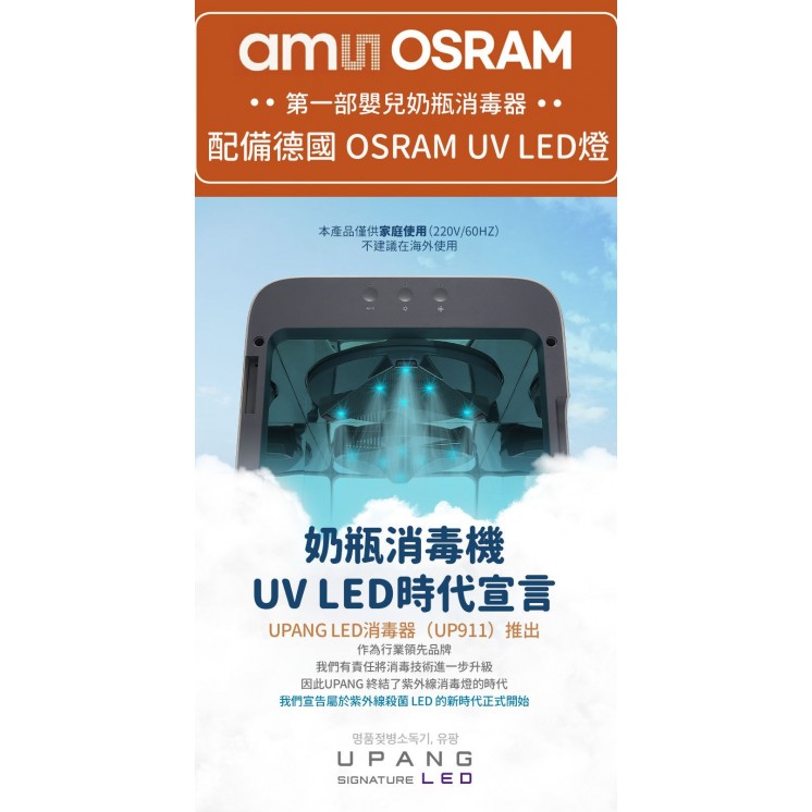5. 採用OSRAM UV LED消毒 : 能高效殺菌和淨化環境 毋須使用任何化學物質進行消毒 因此UPANG不會產生有害的殘留物(如臭